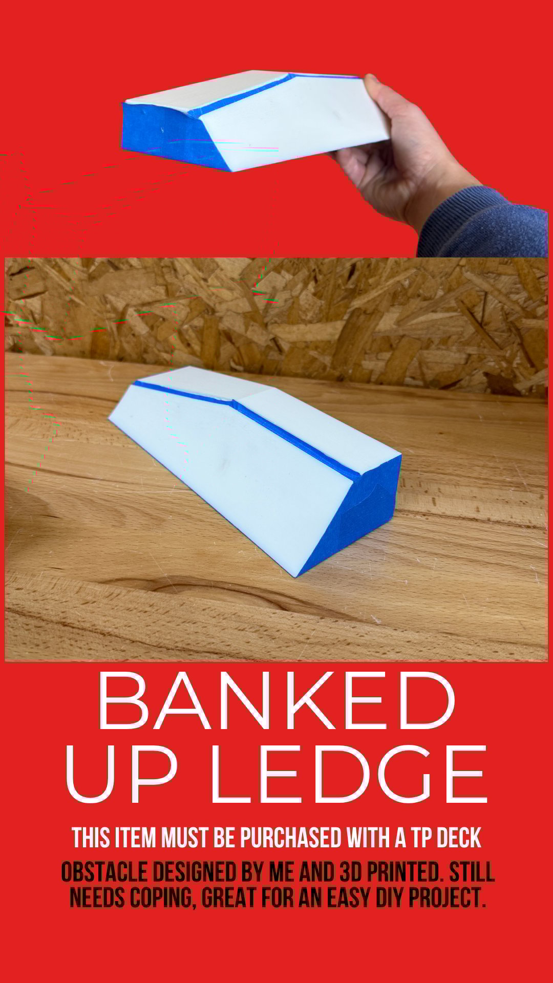 3d printed, coping has not been added to this. simple DIY project for a fun obstacle.This item must be purchased with a deck or your order will be refunded.