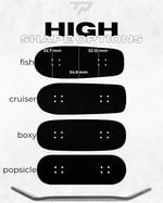 The fish and cruiser shapes can fit either 32mm or 34mm trucks due to their tapered profiles. These are great options if you like widths between 32mm and 35mm.
