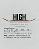 Retro - high kicks, low concave. Designed to emulate the feel of Flatface G12 decks, this mold has a longer wheelbase and flowy dips.