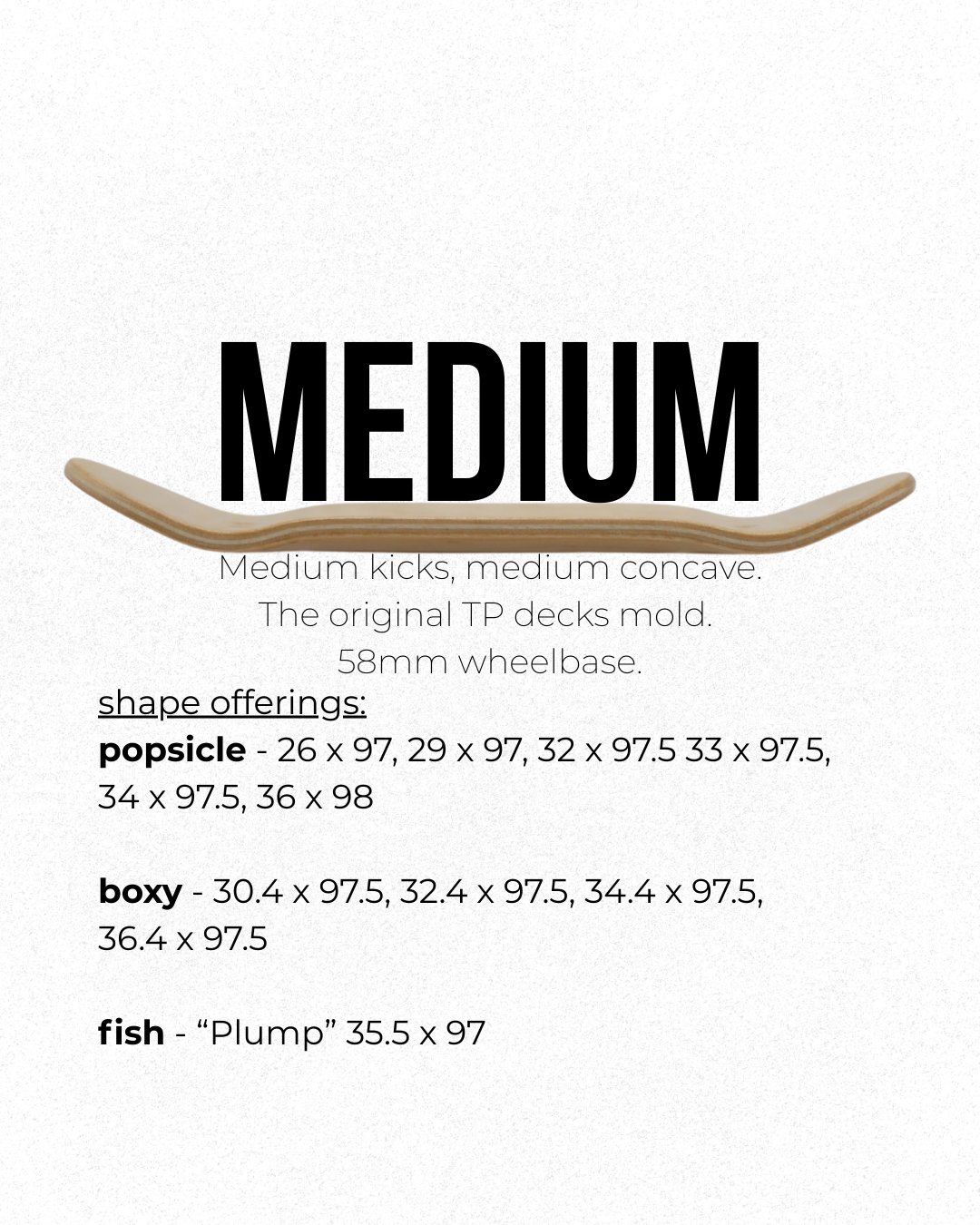 The Medium mold has medium kicks and medium concave with a 58mm wheelbase. This mold was originally created in 2011 and still stands the test of time despite many different trends in fingerboarding in the past 15 years.
