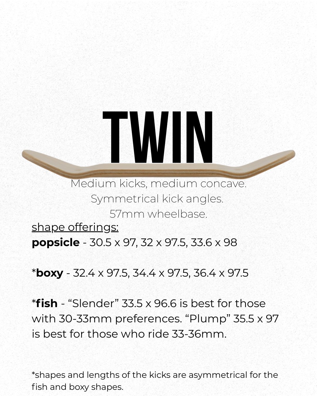The Twin mold has symmetrical, medium kicks and medium concave with a 57mm wheelbase. There is also incorporated concave into the kicks to help improve precision on technical tricks.